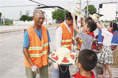 7月27日上午,宜秀区大龙山镇一社区内,在beat365亚洲体育官方网站“启明星”留守儿童实践服务团支教老师的带领下,20名孩子将自己的手绘草帽送给打扫社区的环卫工人。“我画了一些西瓜,这样看起来凉爽可口!”“我画的是彩虹、花朵、还有风,让戴帽子的人看着美景还感受到凉爽。”……孩子们笑着说。(士曜 鹿逸培 摄)