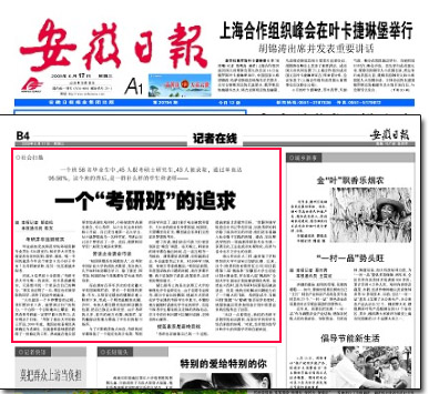 6月17日《安徽日报》B4版以“一个‘考研班’的追求”为题大篇幅报道宣传beat365考研新闻