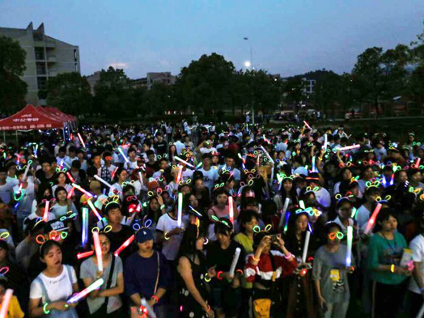 活动正式开始前半小时,学校广场上便聚集了大批前来参加活动的学生。伴随着激昂的架子鼓声和炫彩的荧光棒,现场气氛十分热烈,不时有学生拿出手机与好友自拍留念。