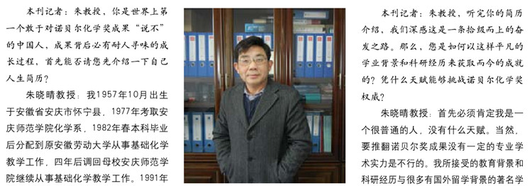 本刊记者:朱教授,听完你的简历介绍,我们深感这是一条拾级而上的奋发之路。那么,您是如何以这样平凡的学业背景和科研经历来获取而今的成就的?凭什么天赋能够挑战诺贝尔化学奖