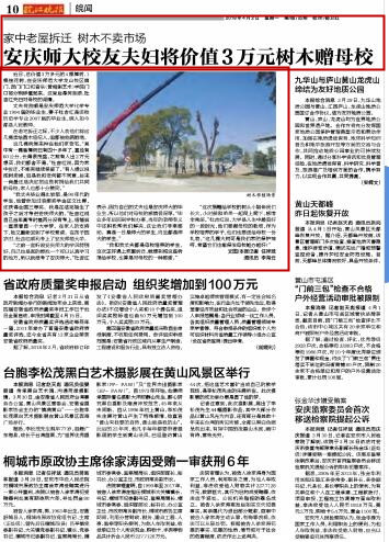 中青在线:老宅拆迁,安庆师大一对校友夫妇移树赠母校 http://news.cyol.com/yuanchuang/2018-03/30/content_17063901.htm