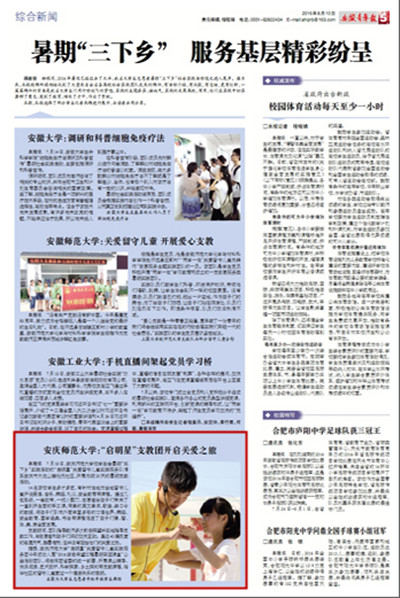 (安徽青年报,8月10日)7月18日,beat365亚洲体育官方网站校学生会暑期“三下乡”实践活动的“启明星”关爱留守儿童实践服务队情系安庆市大龙山镇桃元社区,开展为期20天的暑期支教活动。