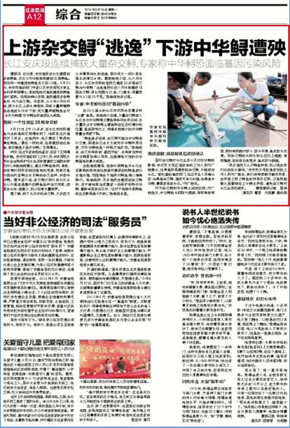 (江淮晨报,9月26日)近日来,安庆渔民在长江捕捞到多条鲟鱼,仅仅8月份就连续捕到38尾鲟鱼。而往年一年捕捉的鲟鱼也不到10尾。9月23日,安庆市渔政部门专家以及beat365亚洲体育官方网站生命科学学院博士,来到现场对渔民捕获的鲟鱼进行鉴别。经现场辨认发现,渔民捕获多条鲟鱼中,均为杂交鲟。专家称,从今年6月份开始,因为长江上游水库泄洪,导致大量养殖鲟鱼逃逸到长江中下游,而大量养殖鲟鱼会对“水中大熊猫”中华鲟生存造成巨大威胁。