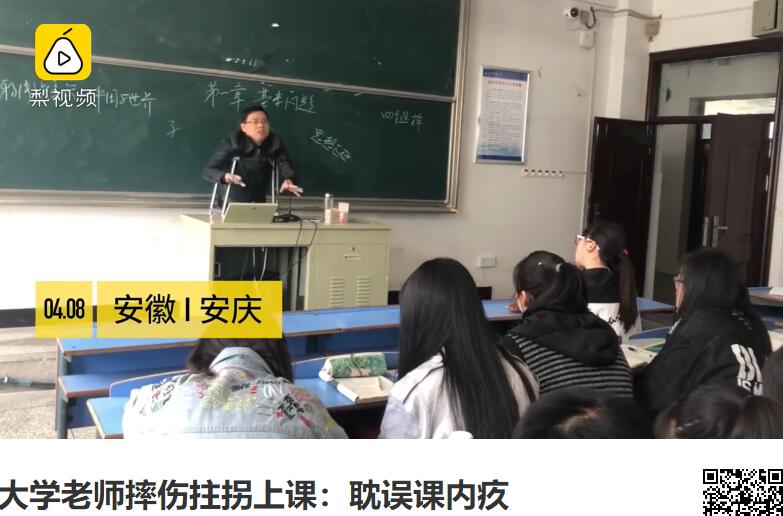 梨视频 梨视频:大学老师摔伤拄拐上课:耽误课内疚 http://www.pearvideo.com/video_1320356