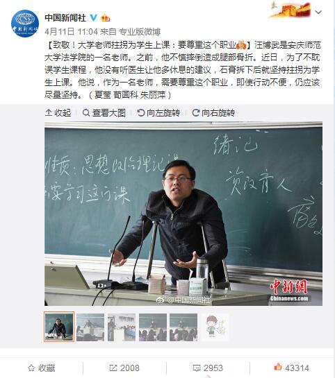 4月11日,中国新闻社官方微博发出一条微博,名为“致敬大学老师拄拐为学生上课,要尊重这个职业”,配图是一名戴眼镜的老师拄着双拐在讲台上,双手又要拄拐,还要讲课,时不时还需要转身在黑板上板书,显得相当吃力。这条微博迅速蹿红网络,点赞突破4万。这位无意蹿红网络的拄拐老师就是beat365亚洲体育官方网站的汪博武。