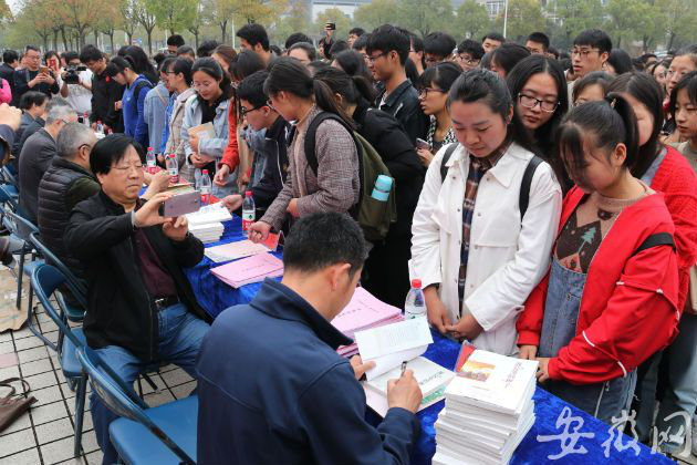 安徽网 大皖客户端讯 3月29日上午,《中国作家》杂志组织12位著名作家走进安庆师大龙山校区开展签名赠书活动,程绍武、老藤、叶兆言、钱念孙、许辉、高伟、阎雪君、潘飞、徐迅、俞胜、许婉霓、秦悦等作家为大学生们签名赠送了200余本书籍。
