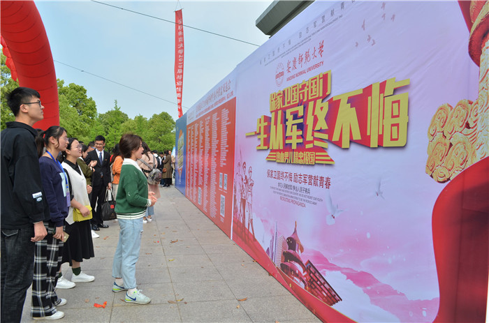 4月27日,安庆师范大学2019年征兵宣传活动在龙山校区体育馆举办。beat365亚洲体育官方网站党委常委、副校长汪时珍,党委常委、研究生院院长吴琼等领导在学生处负责同志的陪同下来到活动现场。