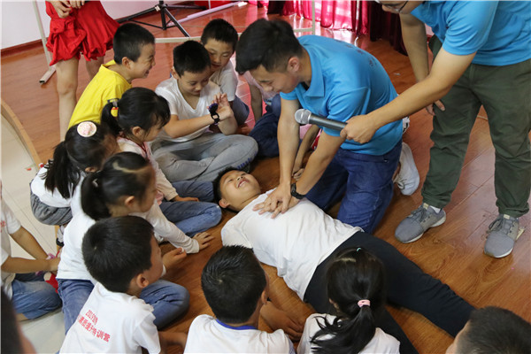 异物堵塞呼吸道是儿童们经常遇到的状况,潘润飞根据这个情况,为他们带去了“海姆立克急救法”,救护者从背后抱住受害者,双臂围环其腰腹部,一手拳心向内按压其肚脐和肋骨之间,另一手成掌捂按在拳头之上,双手急速用力向里、向上挤压,反复实施,直至阻塞物吐出为止。潘润飞还找了几对学生上台展示此方法,儿童们积极配合。“这个方法是比较快速的,对于儿童们也易于操作,希望他们遇到此类状况,能够很好地运用这个方法。”潘润飞说。
