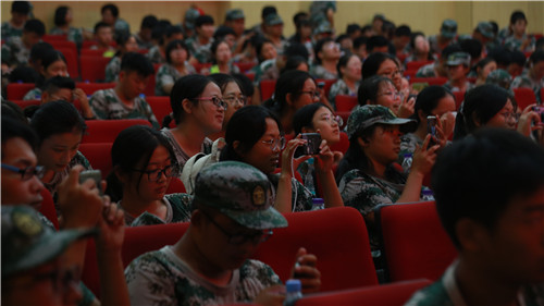 晚会现场,400余名新生还以班级为单位依次登台合唱红歌。《打靶归来》《强军战绩》《黄河大合唱》……这些经典的歌曲在舞台上被新生们一一唱响,唱出了全体学生对党和祖国的深切感恩和深情祝福。