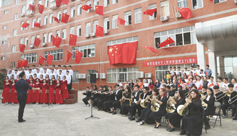 “起来,不愿做奴隶的人们,把我们的血肉筑成我们新的长城……”当雄壮的国歌声响起,全场肃立,齐声合唱。广场上由学生组成的大大的“70”字样,象征着新中国成立70周年。国歌奏毕,悠扬的《歌唱祖国》旋律缓缓响起,艺术楼二楼至五楼窗外40面国旗应声挥舞,迎风招展,蔚为壮观,合唱团团员们和现场师生挥舞着手中的国旗,一起歌唱美丽的祖国。