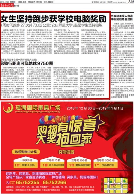 据了解,2017 年,安庆师大引入手机运动软件,将学生记录在软件上的日常锻炼情况与期末体育成绩挂钩。此后,该校 2016 级、2017级、2018级全体学生都必须坚持跑步打卡,而朱颖只是近万名坚持跑步学生中的一个。