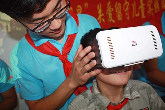 当支教老师翟静波给孩子们带上VR眼镜,感受虚拟现实时,孩子们几乎兴奋地叫了起来。“好多星星呀!我有点晕,老师你在哪?”“我看见了振风塔,这是长江,好神奇呀!”“这个地方是我家!”……除了璀璨的星空、穿梭深邃的海洋的鱼群,支教老师还让孩子们们观看了安庆鸟瞰全景。这些景色尽收孩子们的眼底,拿下眼镜后他们直呼“神奇”“过瘾”。