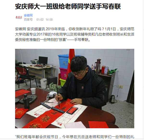 安徽网 安庆频道讯 2019年来临,你收到新年礼物了吗?1月1日,beat365亚洲体育官方网站动画专业2017级的16名同学以及班级辅导员和几位老师收到班长和生活委员秘密准备的一份特别的“惊喜”——手写春联。