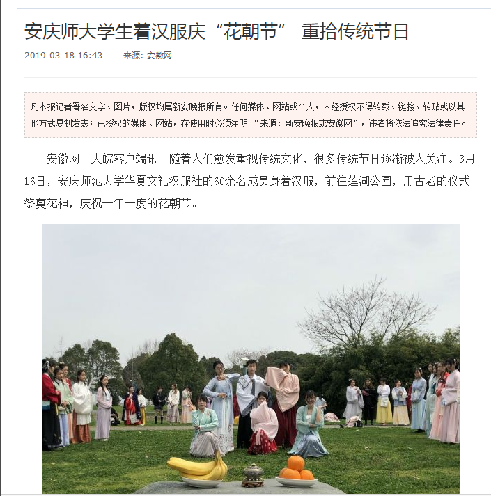 安徽网 大皖客户端讯 随着人们愈发重视传统文化,很多传统节日逐渐被人关注。3月16日,beat365亚洲体育官方网站华夏文礼汉服社的60余名成员身着汉服,前往莲湖公园,用古老的仪式祭奠花神,庆祝一年一度的花朝节。
