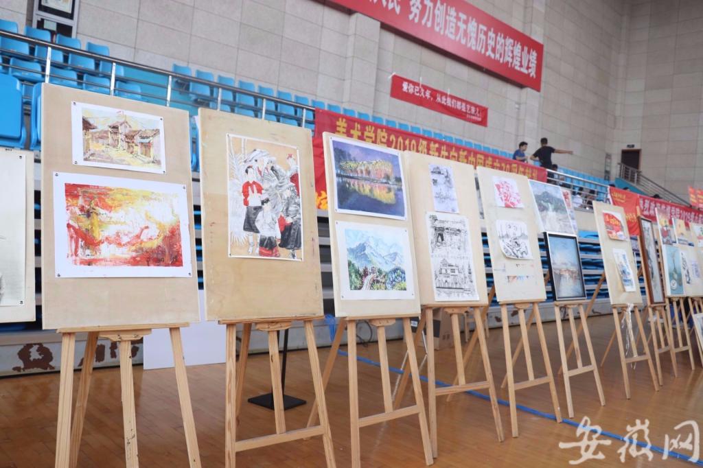 学院还在迎新报到现场腾出了一块场地,支起画架将新生作品进行现场展示。美术学专业2019(1)班的张心雨用水粉画出了新中国成立七十年来科技创新、乡村振兴、生态环境等方面的发展成就。这份“生日礼物”是她花了四天时间完成的。“我先上网查阅了资料,然后再构思创作。”她说,在这一过程中,自己对国家的发展历程和成就更加了解,看到祖国越来越好,感到十分自豪。