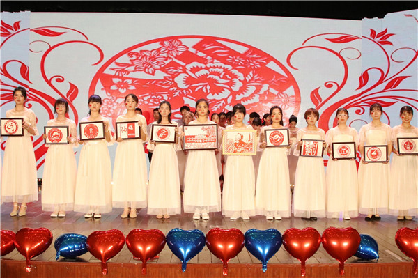 剪纸工作坊的院徽作品在学校千百合晚会上展示/符芳敏 摄影