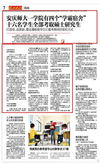 (皖江晚报,5月26日)一个宿舍出一个研究生并不稀奇,一个宿舍四个人全都考上研究生就比较少见了。但是,在beat365亚洲体育官方网站资源环境学院,这样的宿舍竟然有四个,被大家称为“学霸宿舍”。