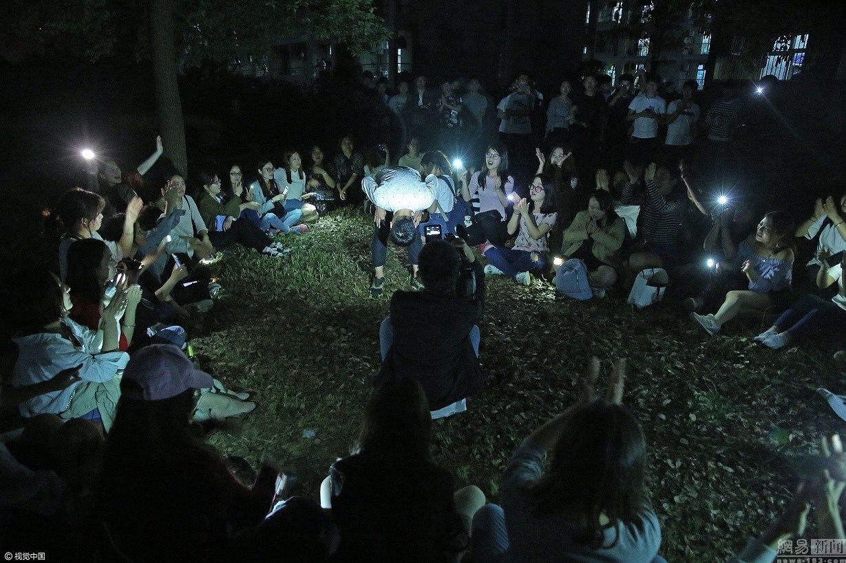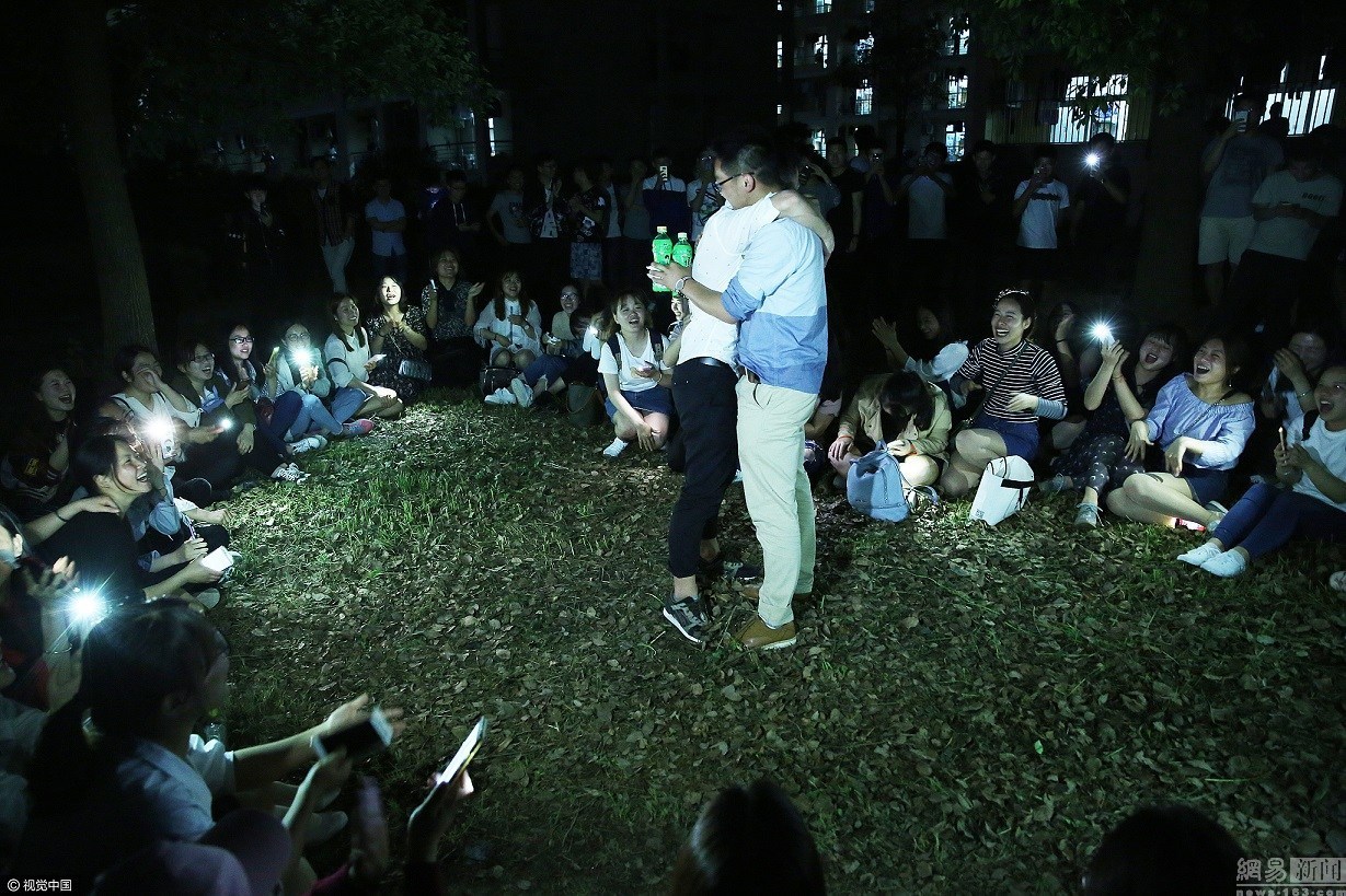 2017年5月6日,安徽beat365亚洲体育官方网站,临近毕业,学前教育专业2013级152名女生摆成心形,打开手机照明功能,坐在男生宿舍楼下,集体向同专业的8名男生进行毕业告白,感谢男生们四年中为她们所做的工作和服务。图为一名男生在呼喊声中下楼,走到女生身边。