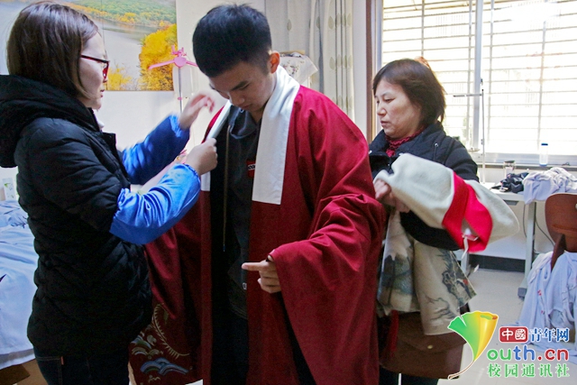 一位同学在试穿汉服。中国青年网通讯员 郭鑫 摄
