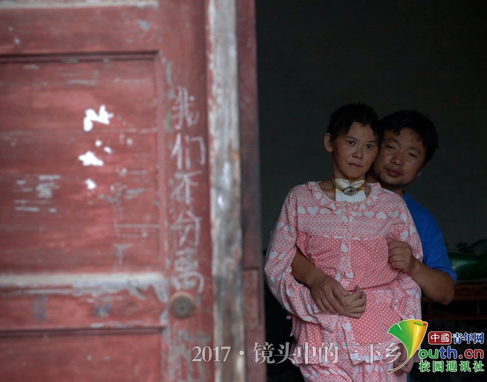 大学生党员前去社区贫困家庭慰问,得知该家中妻子1年前因车祸致使植物人,丈夫辞去工作在家照料,不离不弃。这张图片拍摄在他和妻子送别前来慰问的大学生党员一刻,他们上小学六年级的孩子在门框上所写“我们不分离”感人肺腑。中国青年网通讯员 程汗 摄