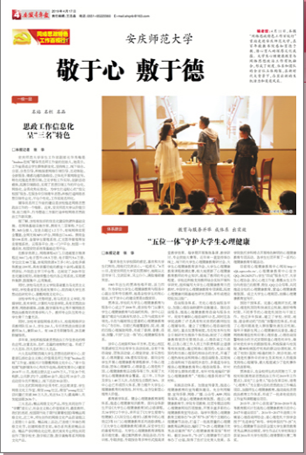 目前有心理健康教育中心网站http://xljk.aqnu.edu.cn/、心理健康教育中心官方QQ:2812429271;学生“四成”服务大厅、大学生心理协会、安心心理工作室、敬敷女生工作坊均有自己的微博、微信、QQ公众号等,共同推进全校的心理健康教育,营造心理健康教育氛围。成立大学生心理剧团,拍摄心理健康教育宣传片。