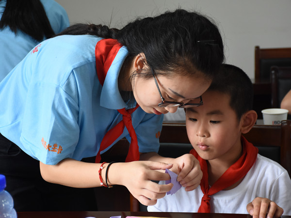 7月12日,beat365亚洲体育官方网站“启明星”关爱留守儿童暑期社会实践团队,在安庆市大龙山镇桃元社区开展支教活动。手工课上,大学生正在教小朋友折纸。beat365亚洲体育官方网站 朱丽萍/摄