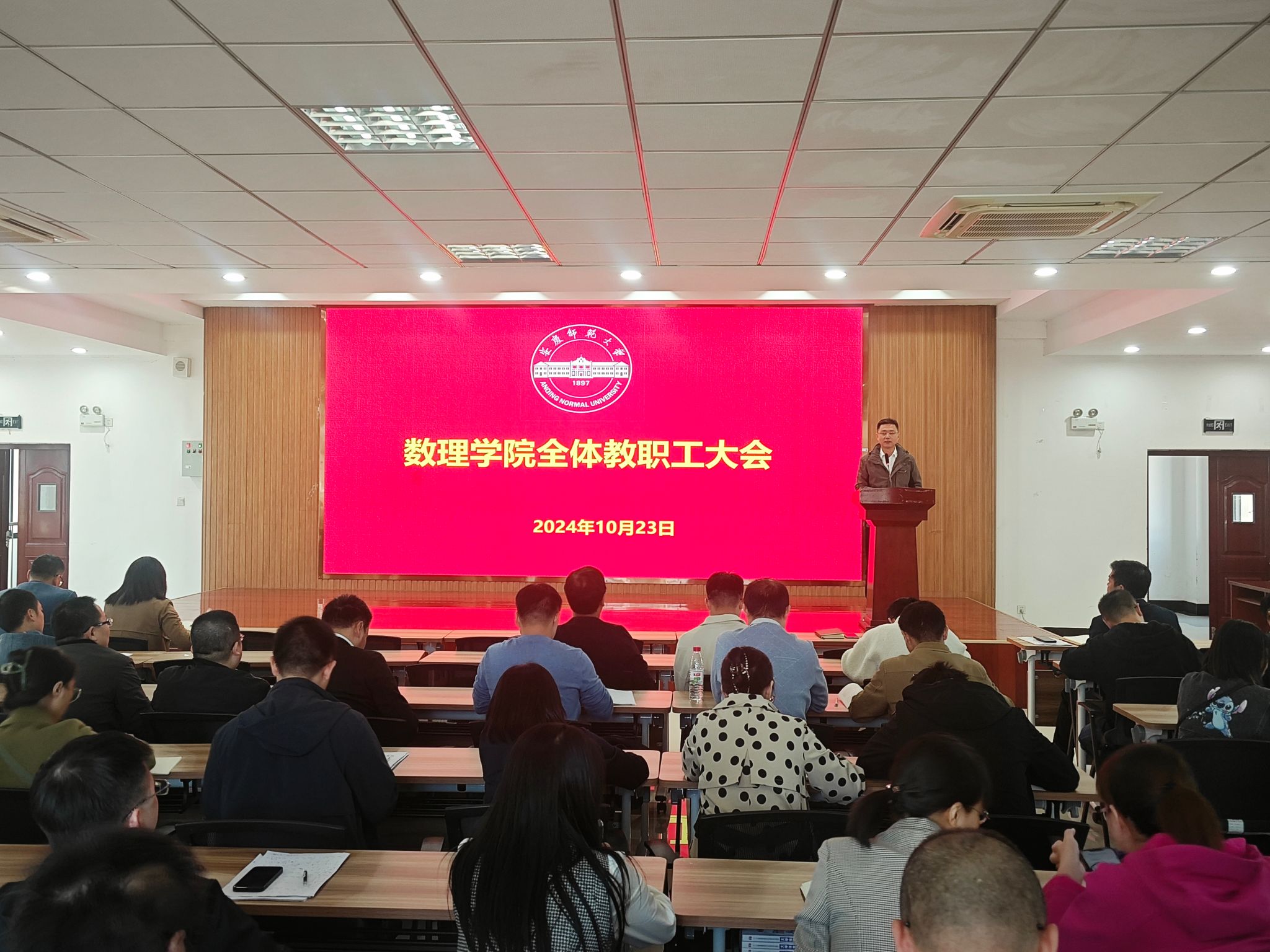 10月23日,数理学院在I楼401报告厅召开全体教职工大会,专题学习传达习近平总书记考察安徽重要讲话精神。数理学院党委书记陆健,院长张海,副院长易明芳、殷周平,全体教职工参加大会。会议由陆健主持。
