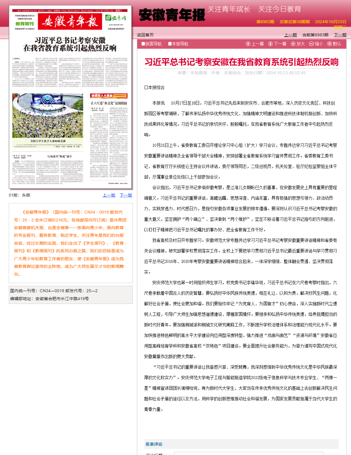 10月17日至18日,习近平总书记先后来到安庆市、合肥市等地,深入历史文化街区、科技创新园区等考察调研,了解传承弘扬中华优秀传统文化、加强精神文明建设和推进科技体制机制创新、加快科技成果转化等情况。习近平总书记的亲切关怀、殷殷嘱托,在我省教育系统广大教育工作者中引起热烈反响。